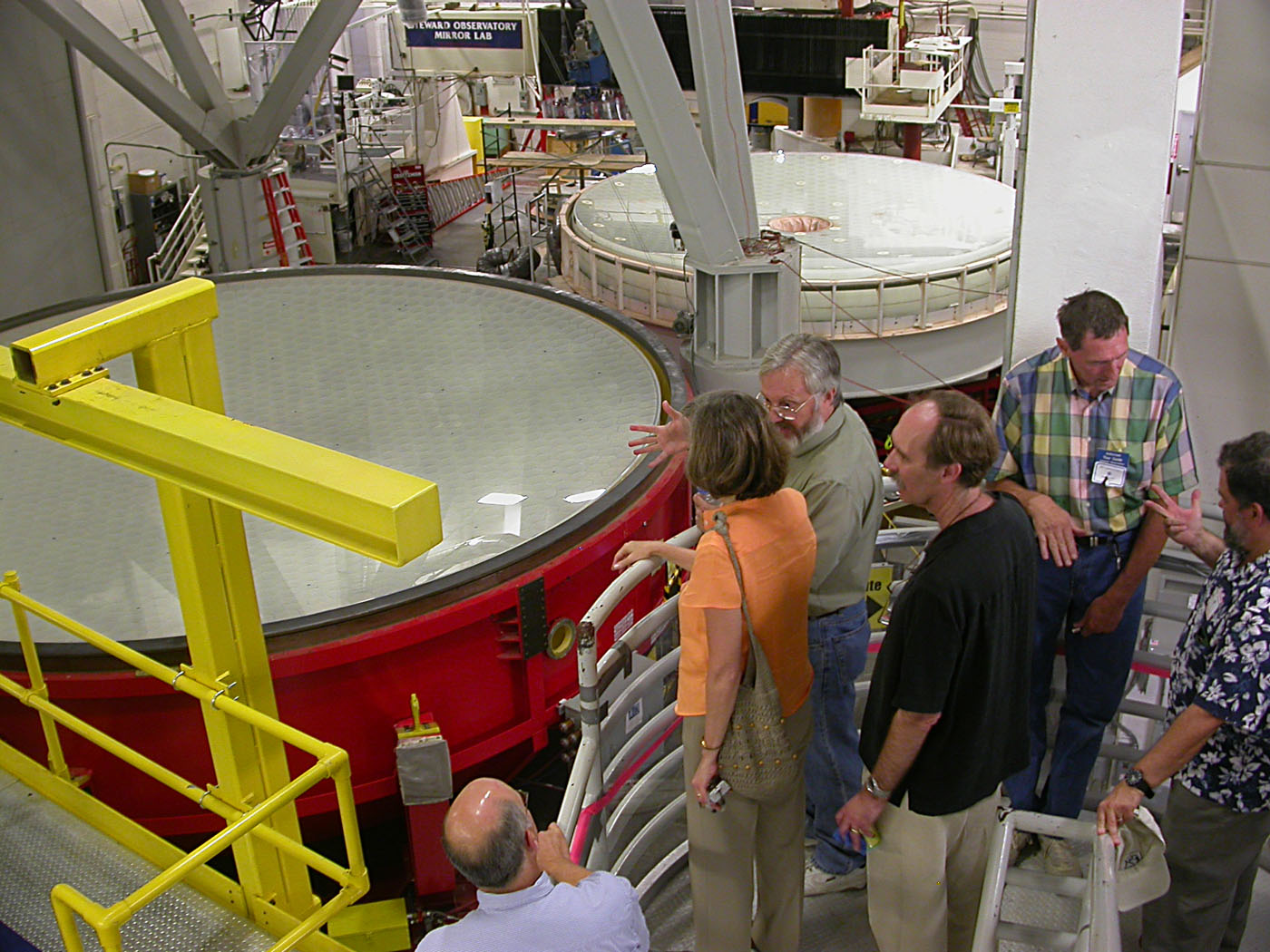Astronomers look over two new mirrors at the Steward Observatory Mirror Lab in Tucson. The one to the left with the red rim is the second 8.4 meter honeycomb glass mirror for the Large Binocular Telescope (LBT). To the right is a smaller 6.4 meter mirror for Lockheed Corporation. For reference the Palomar Telescope in California has a 5-meter mirror (200 inches). |
