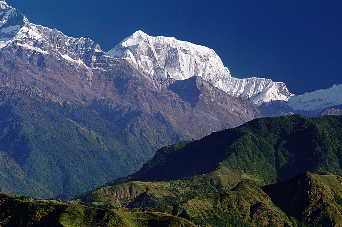 Wide field view of snow-cappcd Annapurna 3 (24,786 ft). To the left (west) of Annapurna 3 is the eastern portion of Mt. Machhapuchhare