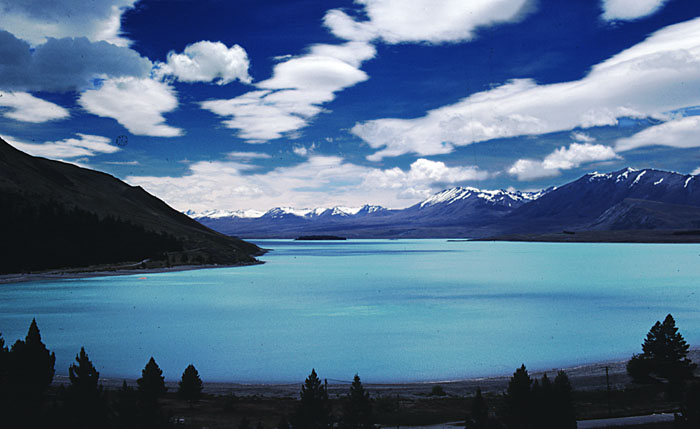 of the lake is created by "rock flour" -- finely ground particles of rock held in suspension in the glacial melt water. Gouged out by a glacier thousands of years ago, Lake Tekapo is 2300 feet above sea level and fed by the Godley, Cass and Macauley Rivers -- all good fishing spots.  |