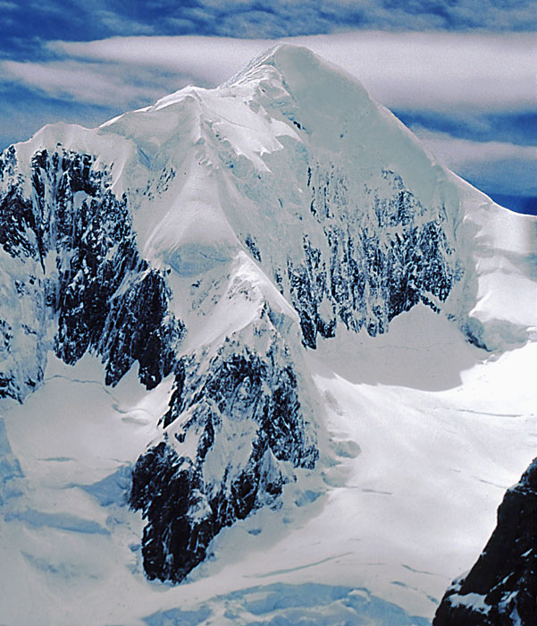 Mount Tasman (Kotuku) at 11,476 feet (3,498 meters) is the second highest peak in New Zealand and stands just two miles north of Mount Cook (12,355 ft). Tasman is a great white mountain, covered entirely in snow and ice. Its great glaciers fill the surrounding valleys, and one of them -- the Tasman Glacier -- is one of the largest temperate glaciers outside of the Himalaya, flowing southward for over eighteen miles. It also forms the Fox Glacier which is shown on this web site. All routes to the summit involve long, steep ice climbing. The main Tasman summit is surrounded by several satellite peaks, including the Silberhorn (10,850 ft.) over which the normal route ascends. |