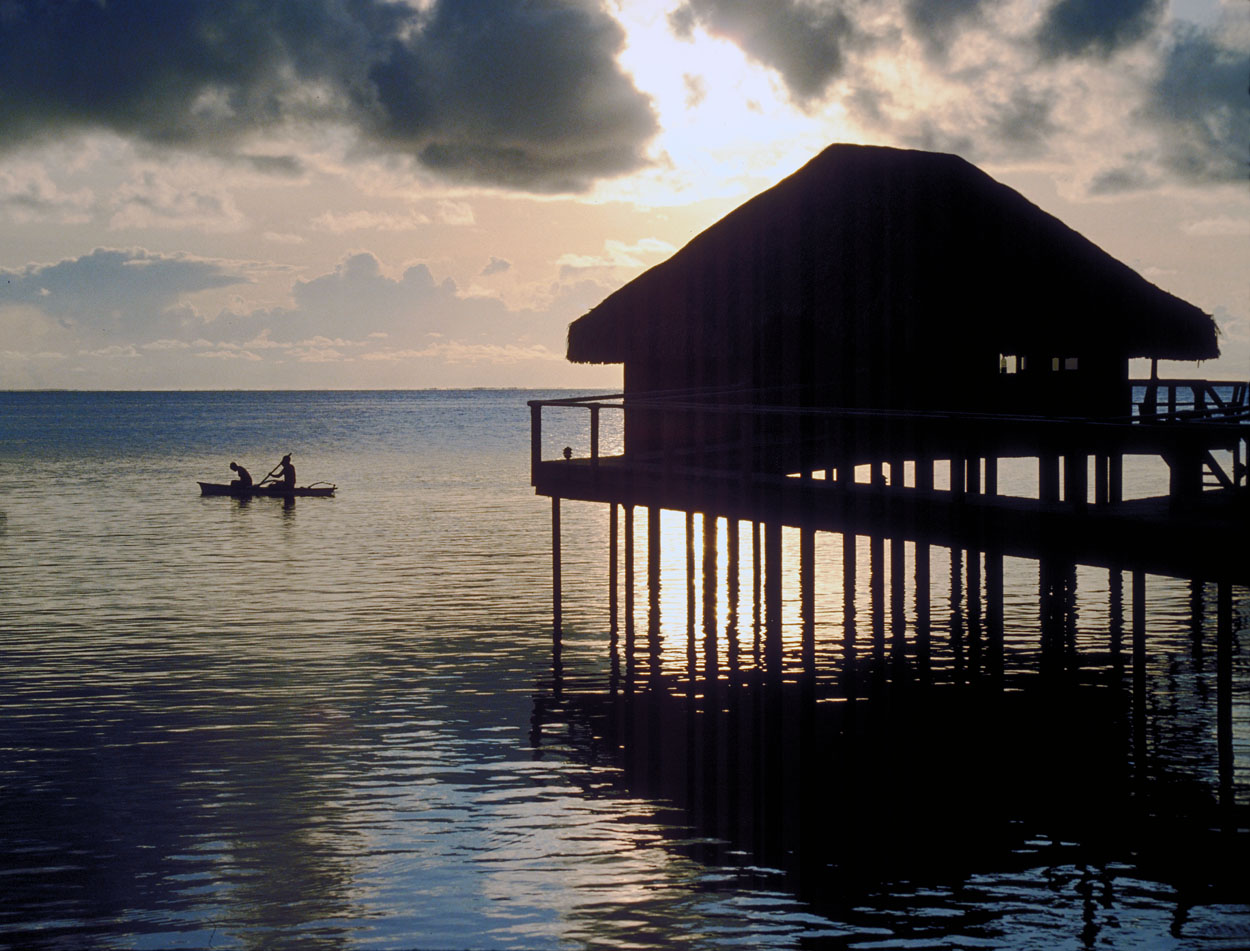 Dugout canoe passes by Hotel Bora Bora at sunset |