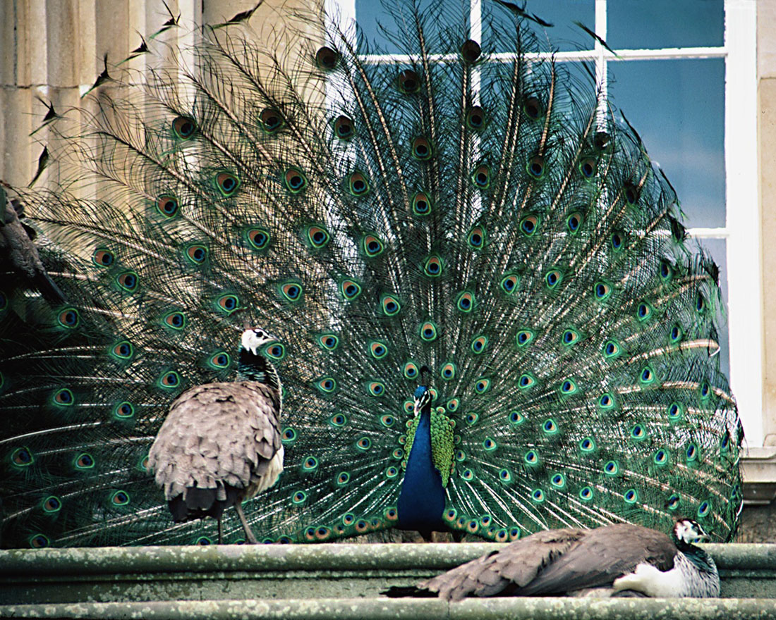 and peacocks and other fauna are scattered throughout the grounds. Inside