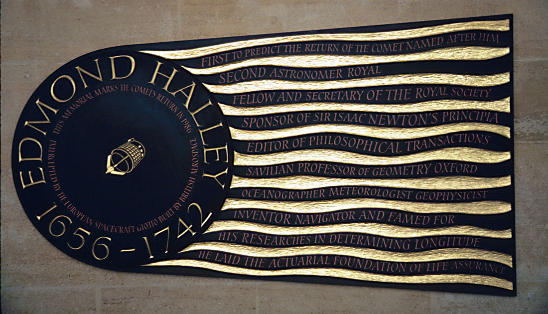 Monument to astronomer Edmund Halley in Westminster Abbey. The comet that bares his name returned in 1066 AD when Harold II was defeated by William the Conqueror at the Battle of Hastings. This marked the end of the Anglo-Saxons and the beginning of the Norman reign.