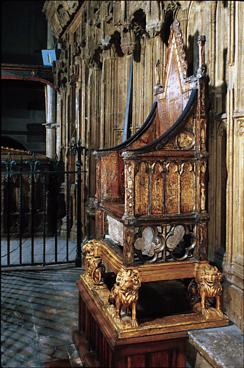 Coronation Chair in Westminster Abbey. The stone beneath the chair is the Stone of Scone which was originally used for coronation of Scottish kings. The English moved it to London after a battle and it was still here when I visited the Abbey in 1987. It has only recently been returned to Scotland.