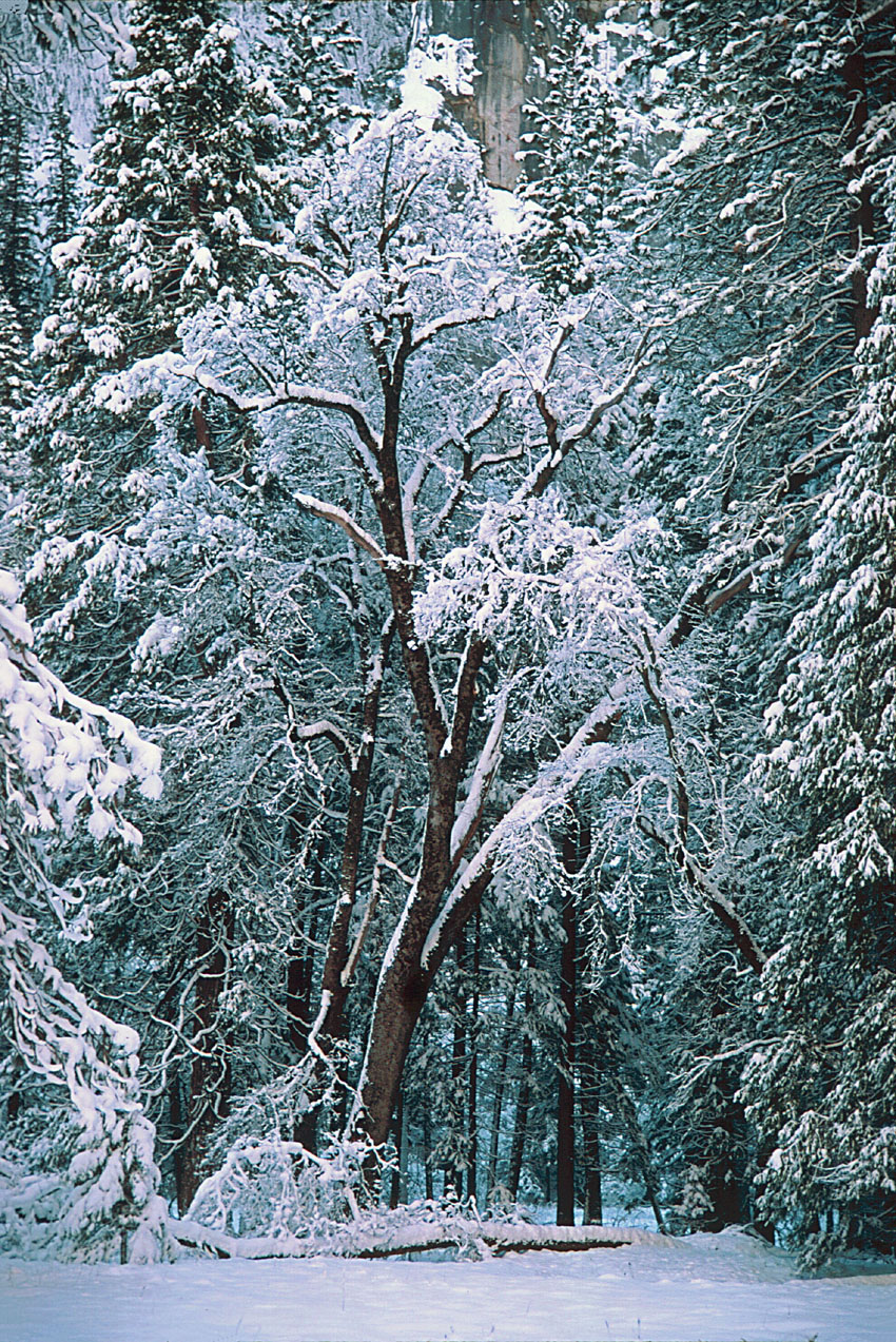 Fresh snow coats the trees of